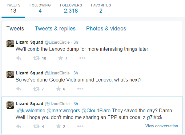Berdasarkan informasi lanjutan yang saya dapatkan, pelaku hacking situs Lenovo adalah pemilik akun twitter @LizardCircle. Berikut adalah screenshoot kicauan dari pemilik akun twitter @LizardCircle,