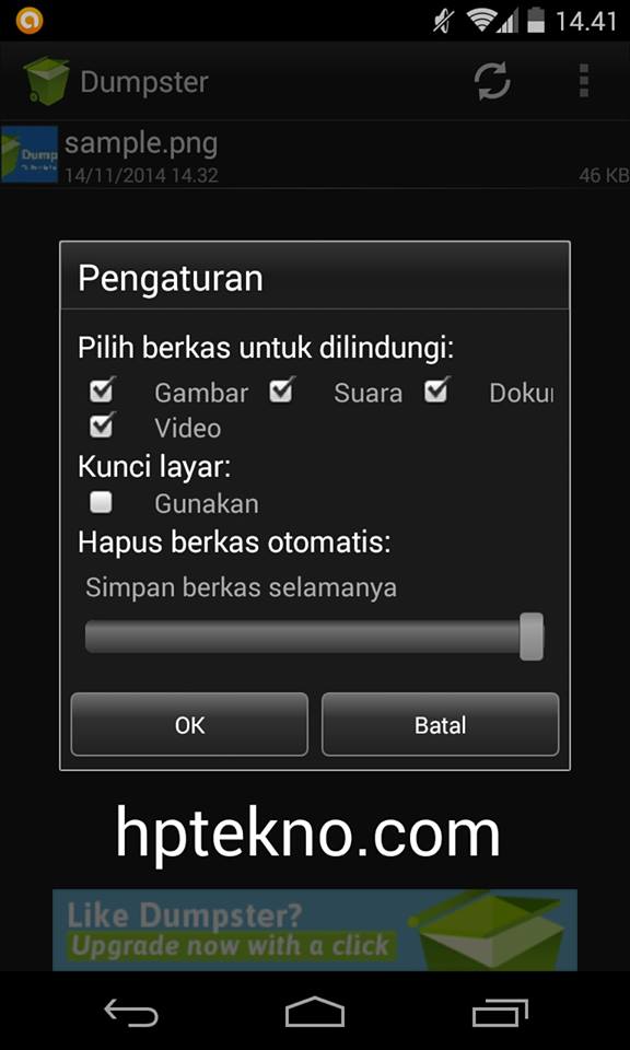Untuk membuat Recyle Bin di Android, anda dapat menginstal Dumpster. Dumpster merupakan aplikasi gratis yang dapat diunduh di Google Play Store. Dumpster dapat memulihkan file gambar, suara, dokumen dan video.